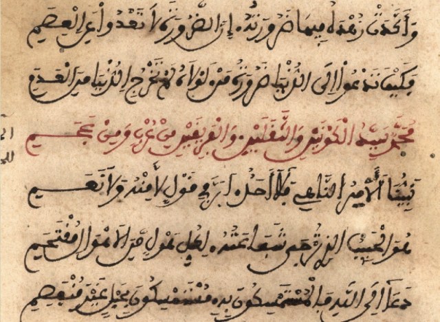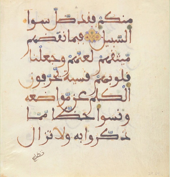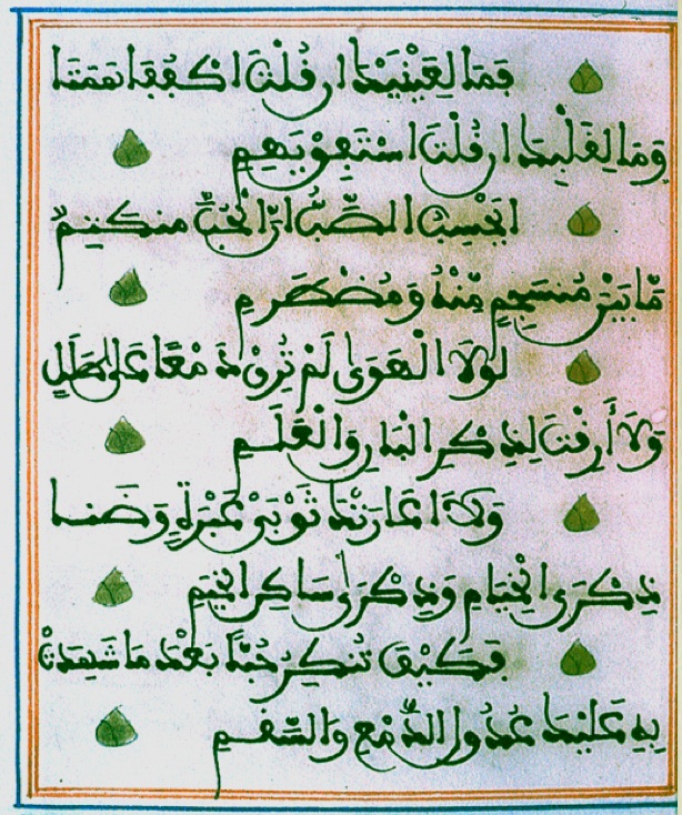 A lot of trial and error and imitation is necessary for the beginner. Although it is possible to buy calligraphic ink, pens and paper the best ink and pen will always be what you make yourself. Coloured inks were often used in fancy Andalusi qur’anic manuscripts for the harakat (the diacritic marks) as in the sample below.