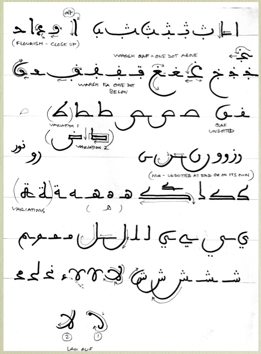 [Above: A page of simple Andalusi letter forms by the author using a felt tip pen on ordinary paper used as a teaching aid]