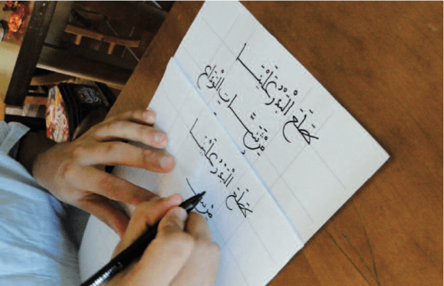 These courses would be held over a period of a few days with each student copying from an existing calligraphic sample. Calligraphy is by its very nature an exercise in hand eye coordination and requires stillness, neatness, concentration and awareness – brain activity in other words. The slightest tremor of thought is registered immediately on paper like some kind of seismometer indicating shivers in the earth’s crust. For people habituated to phone-texting and computer keyboards and the ever present TV remote, this can be challenging but with patience the struggle yields results. For people suffering low attention spans it can be a gratifying exercise as it produces good results quickly. Often as good as the sample being copied. Indeed I had students who after one day were producing good copies of this ancient arabic script, who previously had no experience with a calligraphy pen. It’s the beginning of an enjoyable process of self discovery. But it didn’t end there.