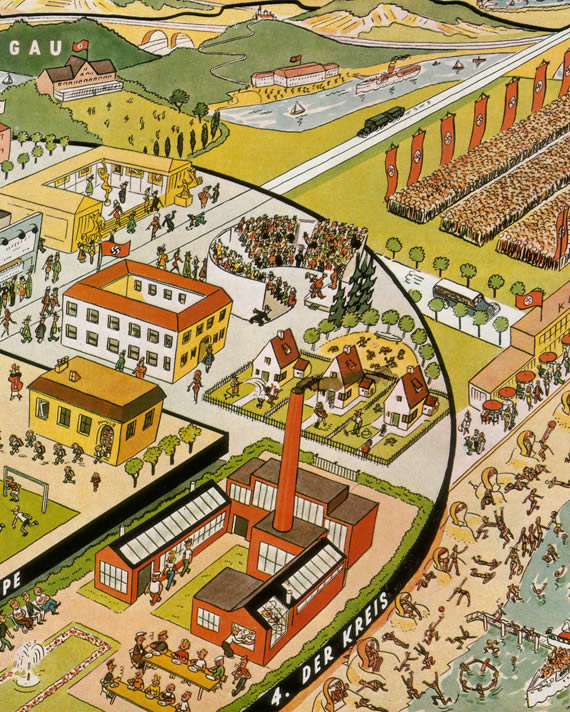 If you can ever find a copy of the English language magazine Signal, a German propaganda magazine, which may have come into Britain via the Irish Republic during WW2 anytime between 1940 and 1945, you will be astonished by its similarity to Life magazine of post war America. In full colour filled with ads for Agfa cameras, Mercedes Benz cars intermingled with friendly fireside chats with the Führer explaining why gypsies would be happier somewhere outside Germany. The rare edition I saw had as a centre spread an artist’s impression of the new ideal German city (part of this is in the attached illustration). It could be Milton Keynes with motorways and business parks etc., except for the fact that in the sports stadium on the right, a great Nazi rally was taking place with men marching around with their arms raised in the roman salute with great Swastikas emblazoned everywhere and enormous German eagles on posts overseeing the crowds.