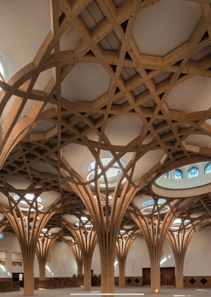 It’s not clear if the spruce tree columns and vaulting are structural i.e. holding the roof up – or not. I think they are not. (correction: they are) A heresy in some architects books. Actually I found out that they are an off-the-peg product by the Swiss manufacturer but specially adapted for the mosque design. To have constructed them in stone like the fan vaulting roofs of Kings College Chapel in Cambridge would have been impossibly expensive. So wood was obviously a simpler proposition. Maybe not so durable as stone. We shall see how it weathers.